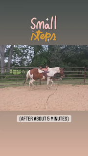 Day 41: Brief ride in the round pen before heading out on the trails. A Blue Heron flew out of the creek as we were riding by and Highlife hardly flinched! He was such a good boy that when we were almost back from the ride I reached back to pat him on the butt (something I do frequently while stopped in the round pen). Apparently, he was not expecting that and all four feet left the ground. Desensitized him to that afterwards so hopefully that won't happen again!